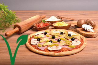 Frischer Teig, Tomatensauce, veganer Pizzaschmelz, Champignons, Artischocken, Peperoni, Oliven