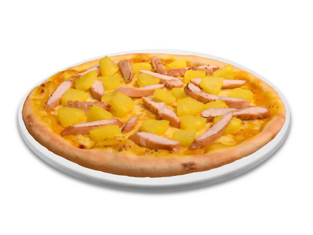 Frischer Teig, Curry Sauce, echter Käse, Ananas, Hühnerbruststreifen